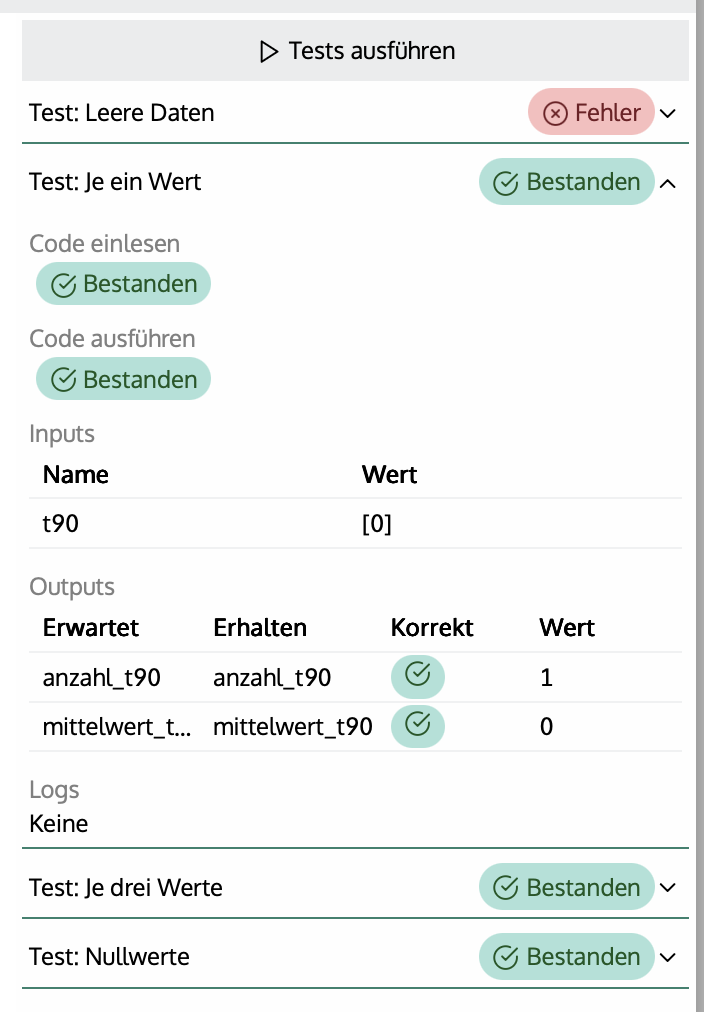 Hinweis: Obwohl ein Test einen Fehler wirft - muss dies nicht einer fehlerhaften Berechnung entsprechen. Hier wird mit Testdaten gearbeitet, nicht mit realen Werten. Das Feedback hilft jedoch grundsätzliche Fehler zu erkennen.