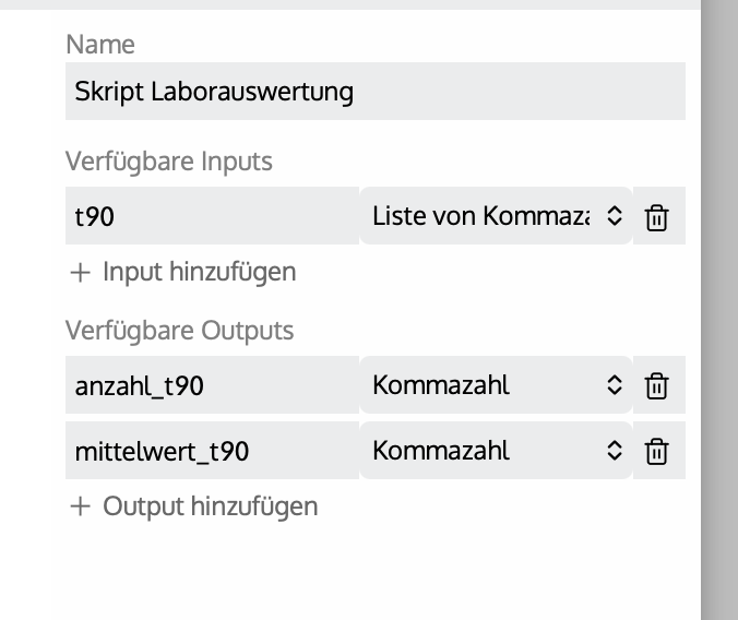 Für jede Berechnung können Inputs und Outputs definiert werden. Die festgelegte Schreibweise wird auch im Java-Script verwendet. Hinweis: Auf exakte Groß- und Kleinschreibung achten!