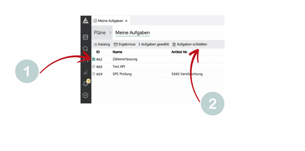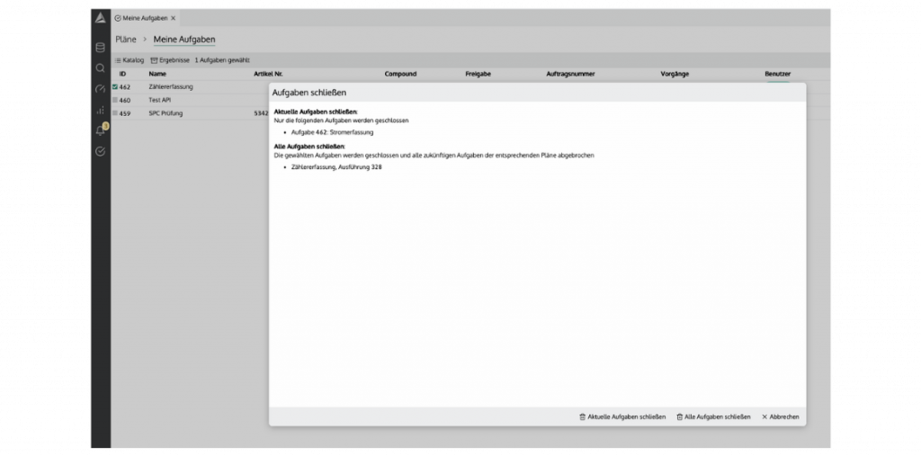 In der Ansicht „Meine Aufgaben“ selektieren Sie über Klick auf die graue Auswahlbox auf der linken Seite die Ausführungen, die abgebrochen werden sollen. Anschließend klicken Sie auf „Aufgaben schließen“ in der grauen Leiste.